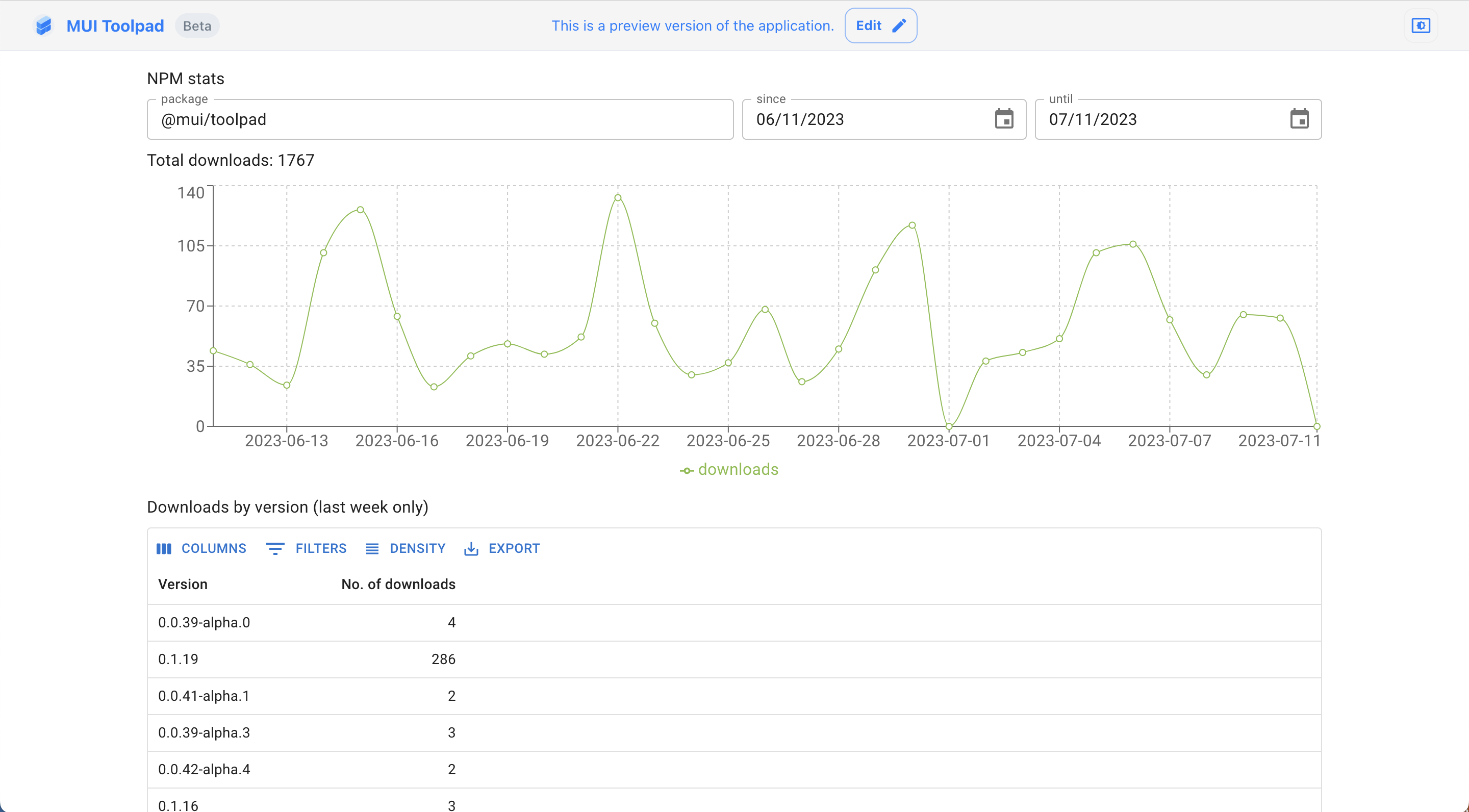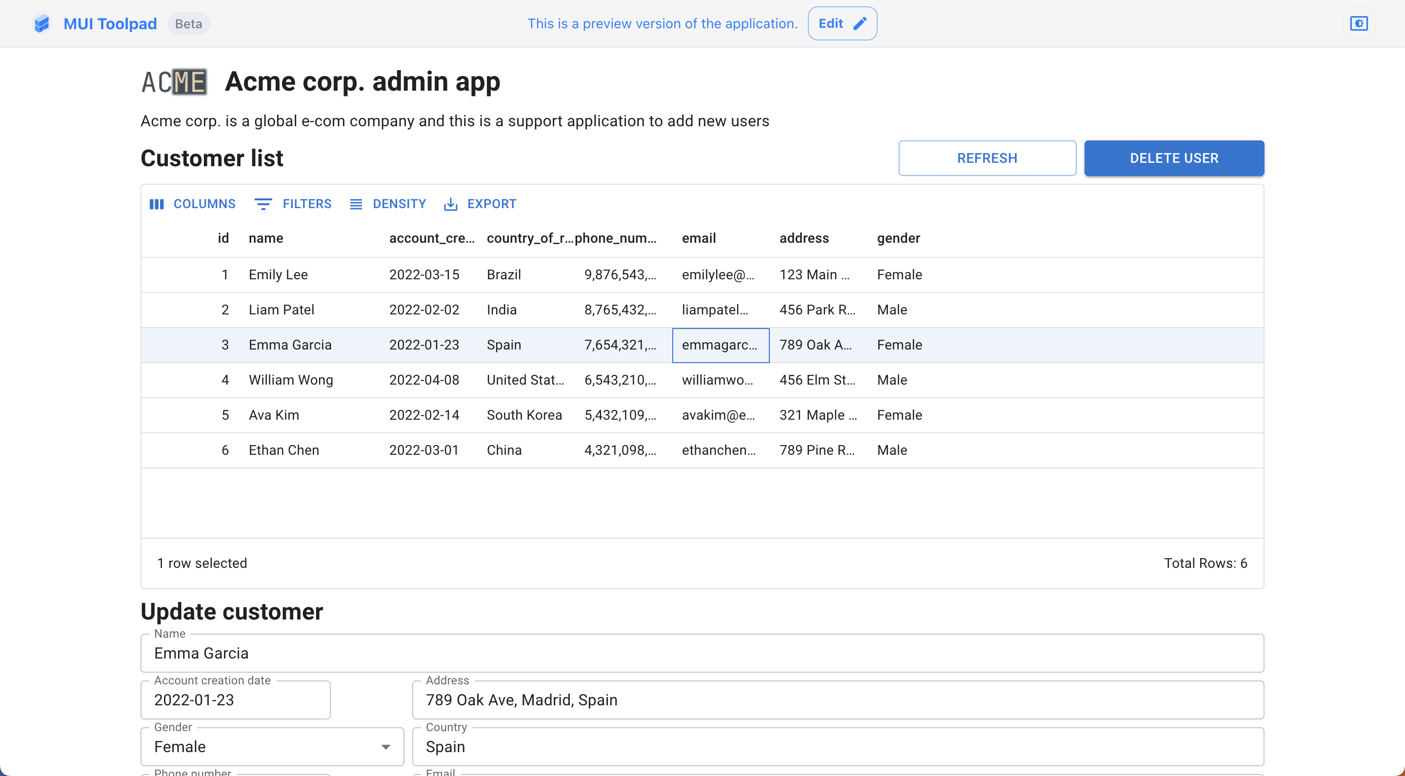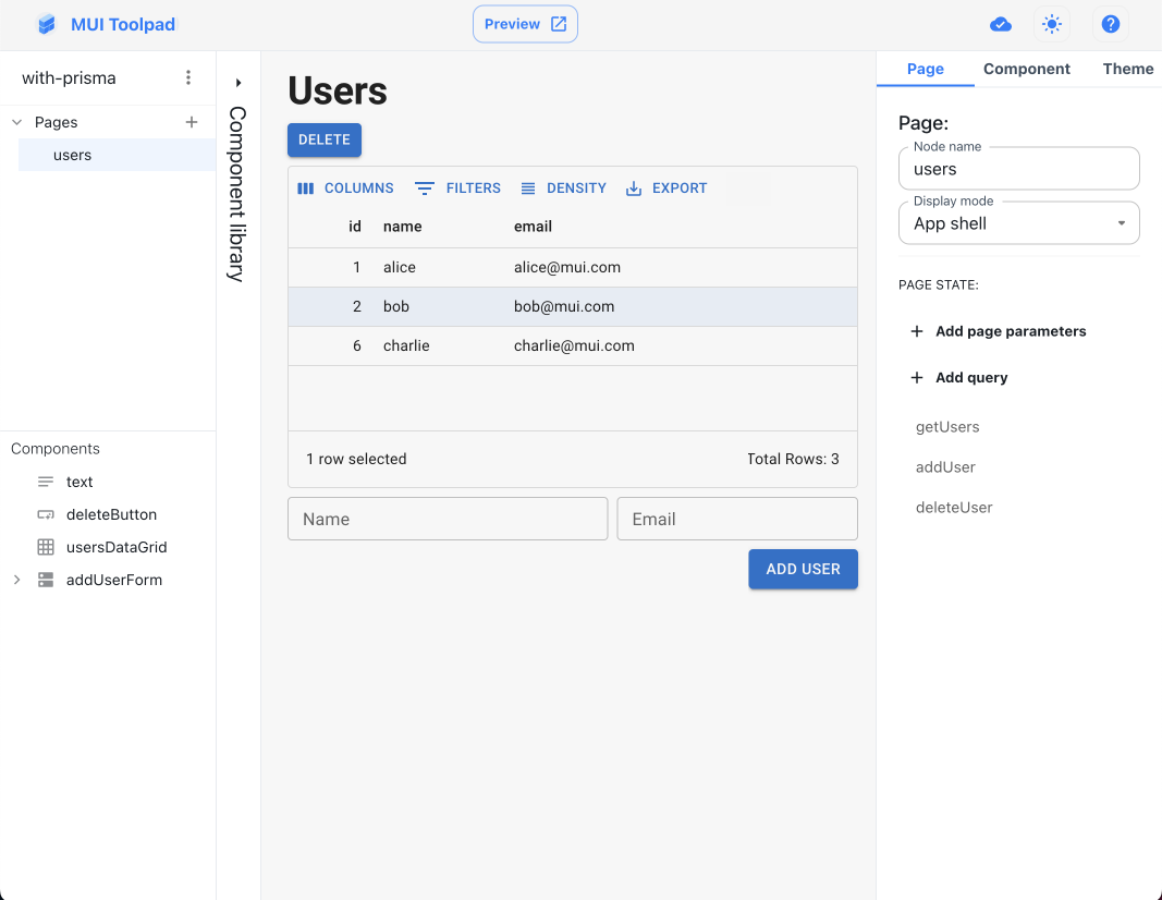 Access the full suite of pre-built MUI components, including both Material UI and MUI X—or bring your own custom components to your Toolpad Studio app.
